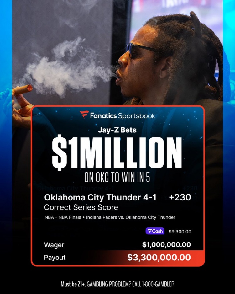 06月12日讯 今日NBA总决赛雷霆VS步行者G3,步行者(2)116-107雷霆 (1)。在总决赛打响前,说唱大亨、著名音乐制作人、商人Jay-Z曾在博彩网站Fanatics重金押注雷霆4:1夺冠,下注金额高达100万美元。根据Fanatics当时开出的赔率(+230),若预测成真,Jay-Z将获得330万美元的巨额回报。本场过后,步行者已取得两胜。Jay-Z的100万美元已打水漂。值得一提的是,Jay-Z是Fanatics的投资人之一。